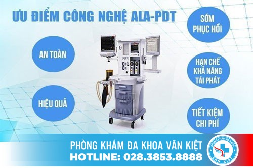 Điều trị sùi mào gà bằng công nghệ ALA-PDT áp dụng tác động qua lại của ánh sáng, oxy và chất cản quang để tiêu diệt mụn sùi, giúp tăng sinh tế bào mới trên bề mặt da. Đây là công nghệ hiện đại hiện nay, mụn sùi biến mất trong vòng 3 ngày. Các ưu điểm vượt trội như không gây đau đớn, mụn sùi triệt tiêu hoàn toàn, ít có khả năng tái phát, cụ thể: